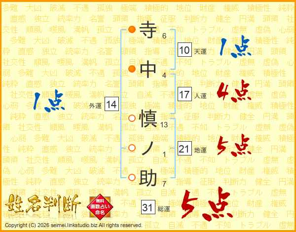 寺(6画)中(4画) 慎(13画)ノ(1画)助(7画)