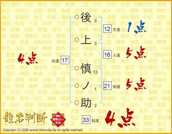 後(9画)上(3画) 慎(13画)ノ(1画)助(7画)