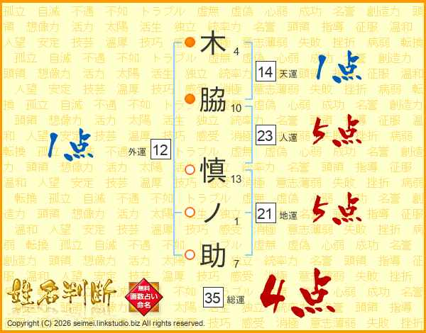 木(4画)脇(10画) 慎(13画)ノ(1画)助(7画)