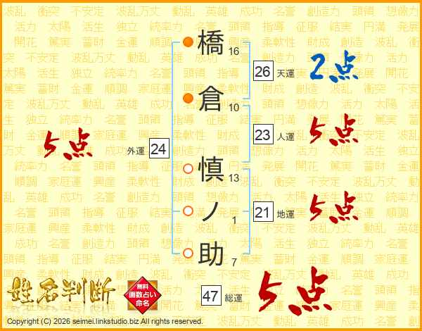 橋(16画)倉(10画) 慎(13画)ノ(1画)助(7画)