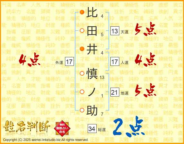 比(4画)田(5画)井(4画) 慎(13画)ノ(1画)助(7画)
