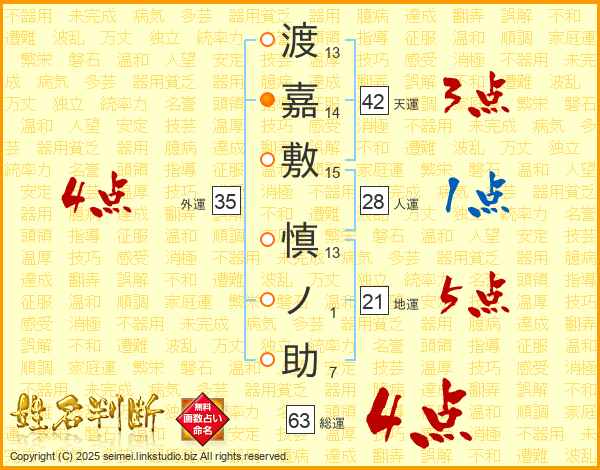 渡嘉敷慎ノ助さんの総運は63画の4点!