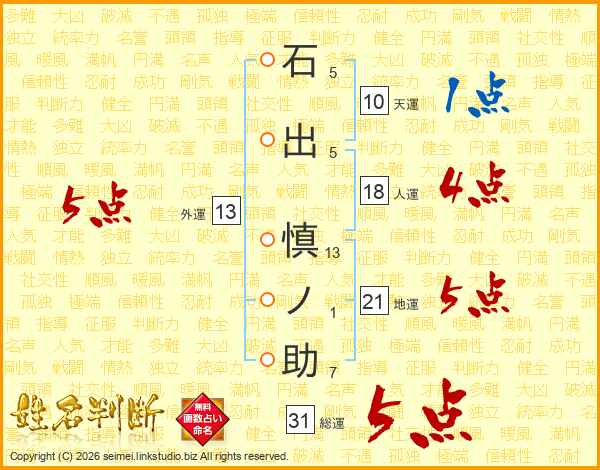 石(5画)出(5画) 慎(13画)ノ(1画)助(7画)