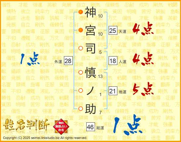 神(10画)宮(10画)司(5画) 慎(13画)ノ(1画)助(7画)