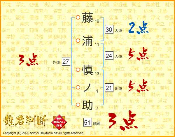 藤(19画)浦(11画) 慎(13画)ノ(1画)助(7画)
