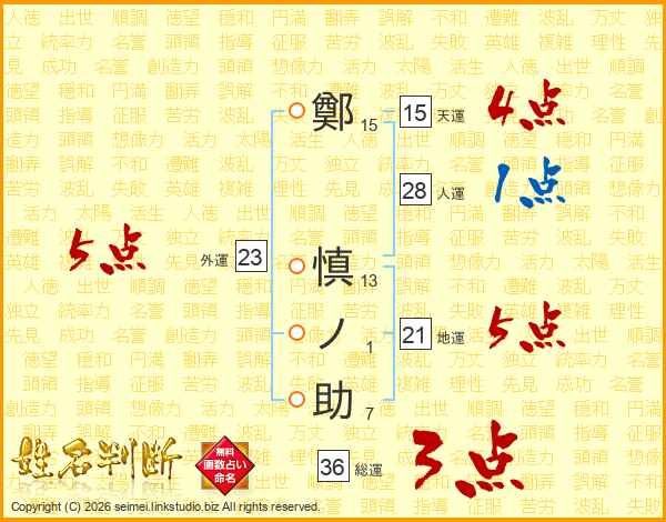 鄭(15画) 慎(13画)ノ(1画)助(7画)