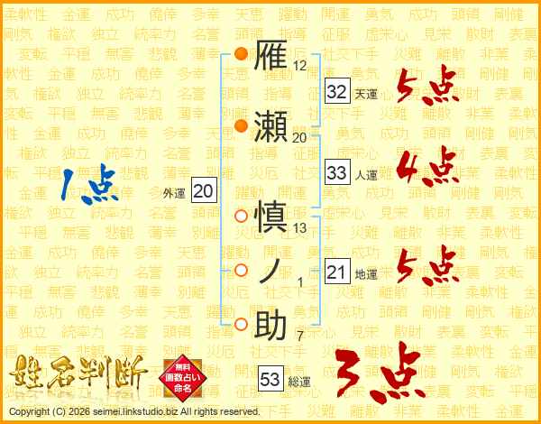 雁(12画)瀬(20画) 慎(13画)ノ(1画)助(7画)