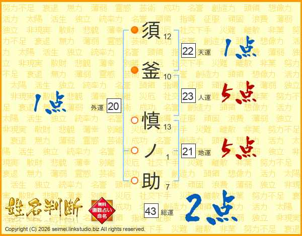 須(12画)釜(10画) 慎(13画)ノ(1画)助(7画)