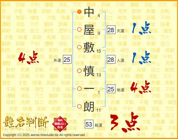 中(4画)屋(9画)敷(15画) 慎(13画)一(1画)朗(11画)