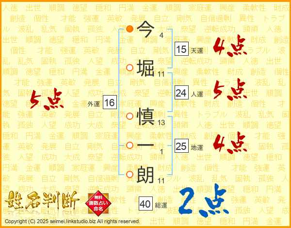 今(4画)堀(11画) 慎(13画)一(1画)朗(11画)
