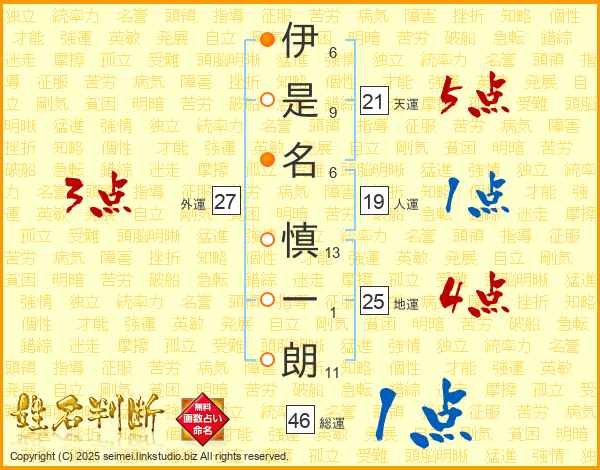 伊(6画)是(9画)名(6画) 慎(13画)一(1画)朗(11画)