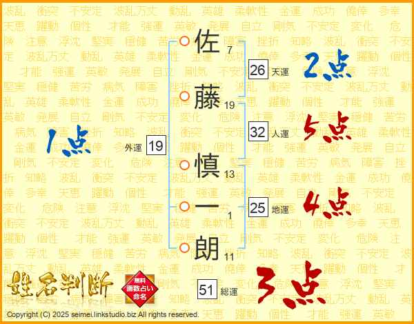 佐(7画)藤(19画) 慎(13画)一(1画)朗(11画)