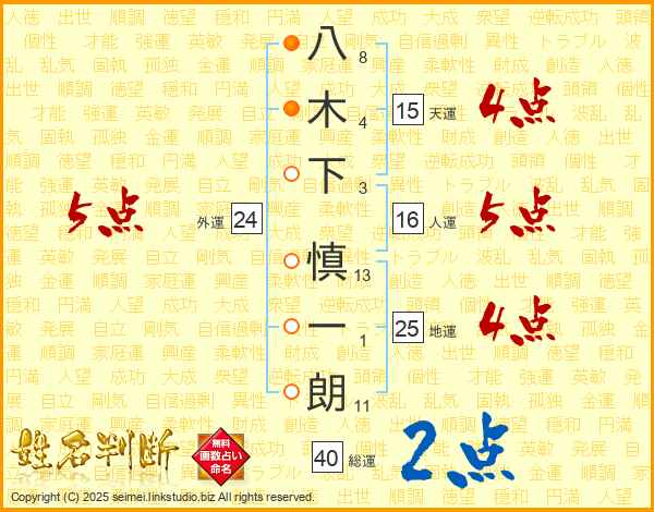 八(8画)木(4画)下(3画) 慎(13画)一(1画)朗(11画)