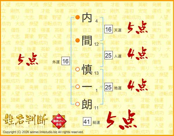 内(4画)間(12画) 慎(13画)一(1画)朗(11画)