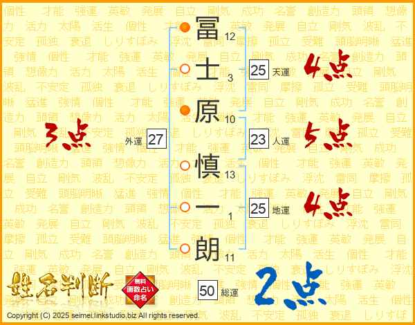 冨(12画)士(3画)原(10画) 慎(13画)一(1画)朗(11画)