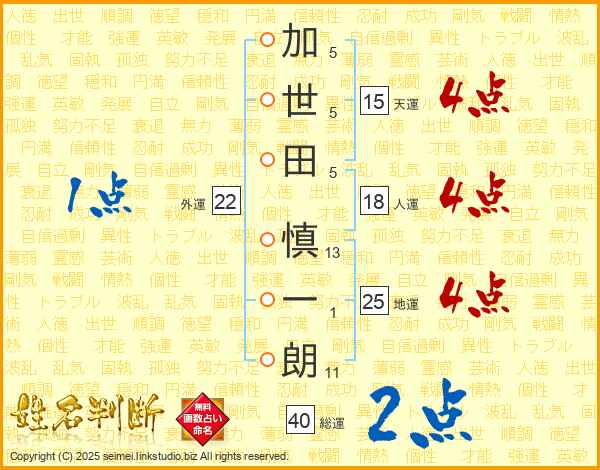 加(5画)世(5画)田(5画) 慎(13画)一(1画)朗(11画)