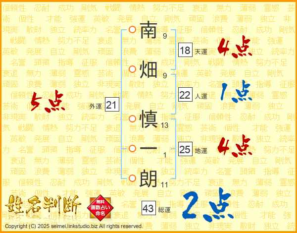 南(9画)畑(9画) 慎(13画)一(1画)朗(11画)