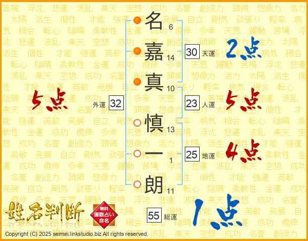 名(6画)嘉(14画)真(10画) 慎(13画)一(1画)朗(11画)