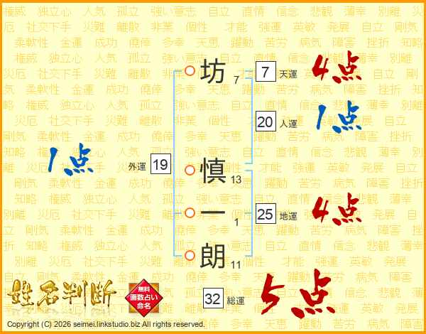 坊(7画) 慎(13画)一(1画)朗(11画)