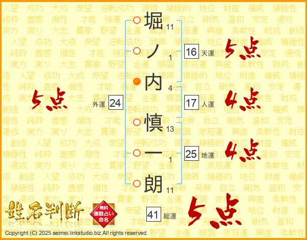 堀(11画)ノ(1画)内(4画) 慎(13画)一(1画)朗(11画)