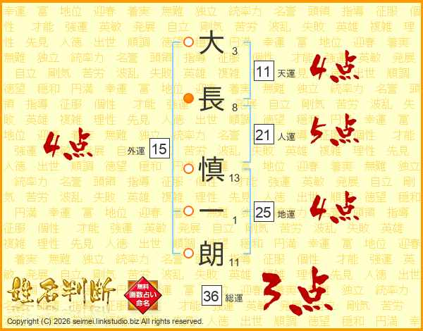 大(3画)長(8画) 慎(13画)一(1画)朗(11画)