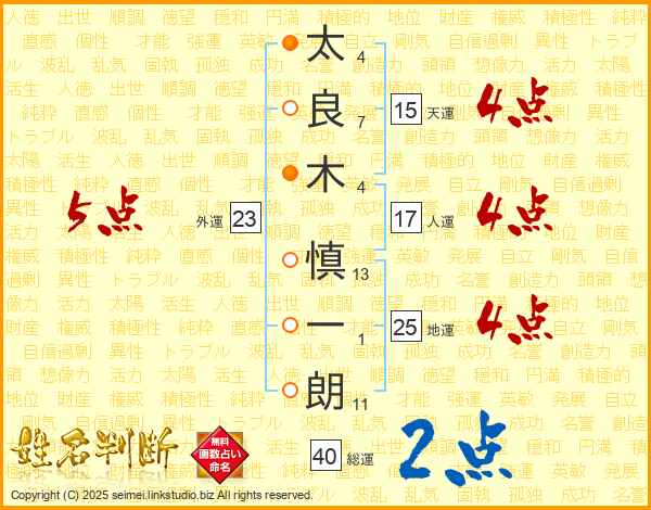 太(4画)良(7画)木(4画) 慎(13画)一(1画)朗(11画)