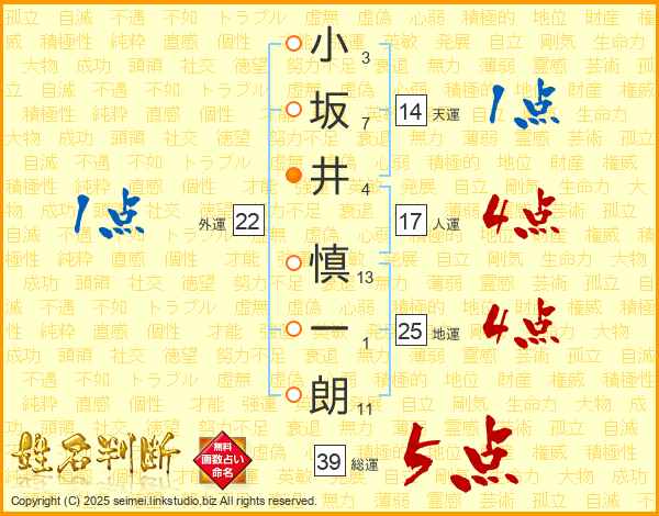 小(3画)坂(7画)井(4画) 慎(13画)一(1画)朗(11画)