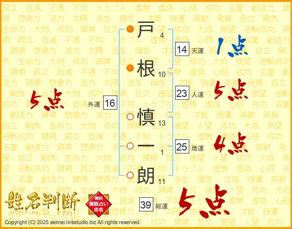 戸(4画)根(10画) 慎(13画)一(1画)朗(11画)