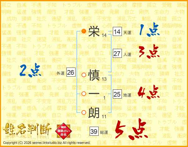 栄(14画) 慎(13画)一(1画)朗(11画)