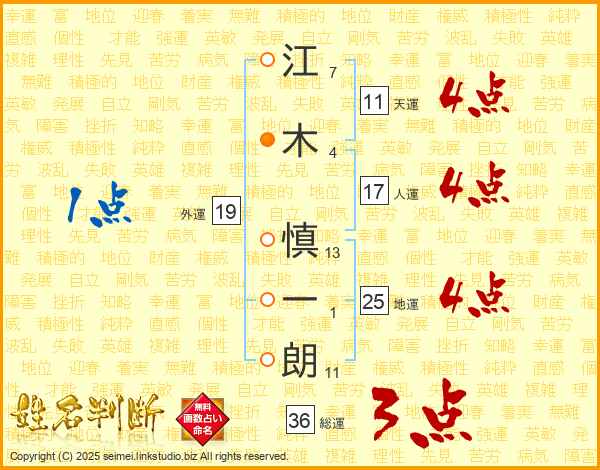 江(7画)木(4画) 慎(13画)一(1画)朗(11画)
