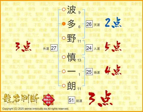波(9画)多(6画)野(11画) 慎(13画)一(1画)朗(11画)