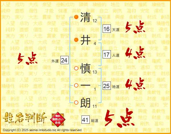 清(12画)井(4画) 慎(13画)一(1画)朗(11画)