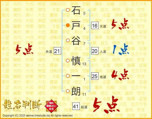 石(5画)戸(4画)谷(7画) 慎(13画)一(1画)朗(11画)