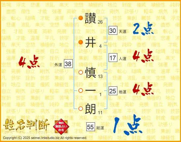 讃(26画)井(4画) 慎(13画)一(1画)朗(11画)