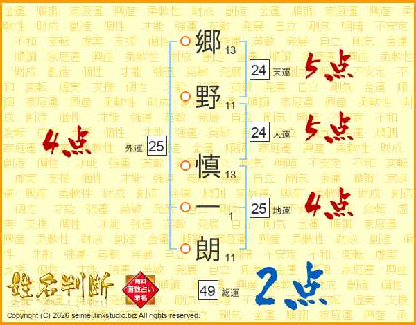郷(13画)野(11画) 慎(13画)一(1画)朗(11画)