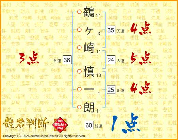 鶴(21画)ヶ(3画)崎(11画) 慎(13画)一(1画)朗(11画)