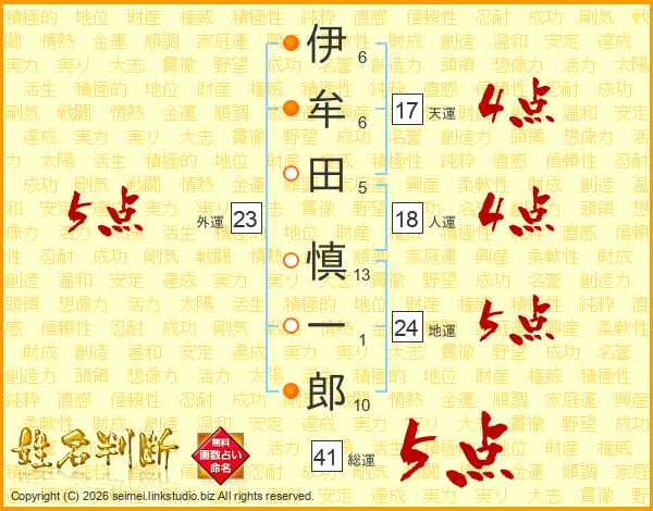 伊(6画)牟(6画)田(5画) 慎(13画)一(1画)郎(10画)