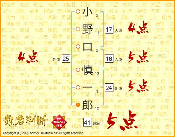 小(3画)野(11画)口(3画) 慎(13画)一(1画)郎(10画)