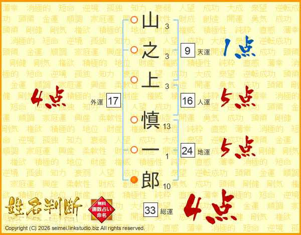 山(3画)之(3画)上(3画) 慎(13画)一(1画)郎(10画)