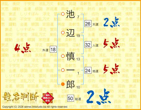 池(7画)辺(19画) 慎(13画)一(1画)郎(10画)