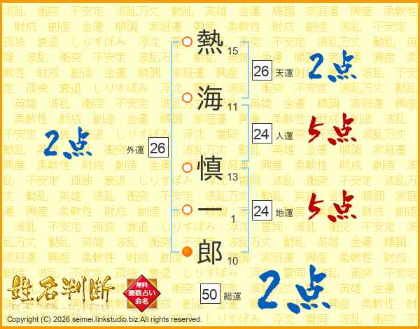 熱(15画)海(11画) 慎(13画)一(1画)郎(10画)