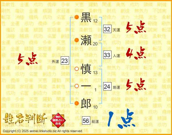 黒(12画)瀬(20画) 慎(13画)一(1画)郎(10画)