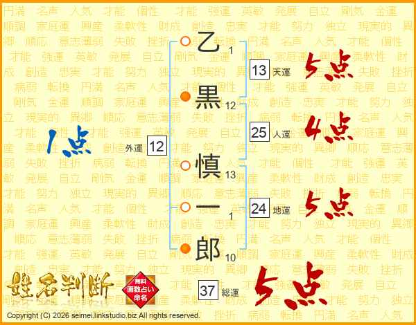乙(1画)黒(12画) 慎(13画)一(1画)郎(10画)