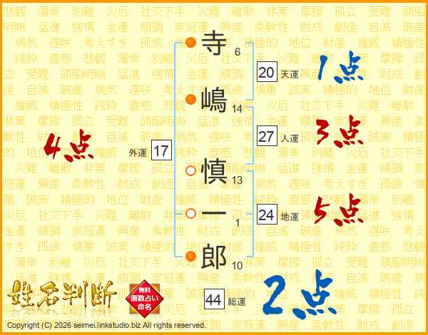 寺(6画)嶋(14画) 慎(13画)一(1画)郎(10画)