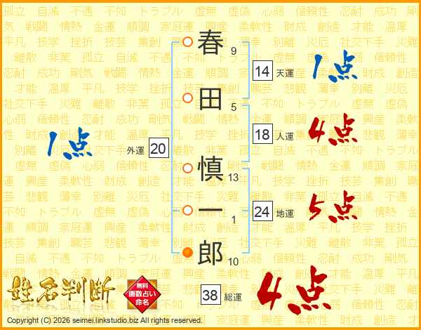 春(9画)田(5画) 慎(13画)一(1画)郎(10画)