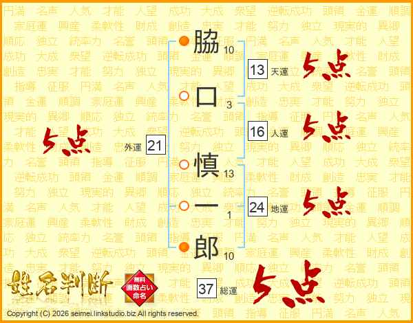 脇(10画)口(3画) 慎(13画)一(1画)郎(10画)