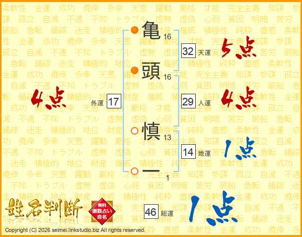 亀(16画)頭(16画) 慎(13画)一(1画)