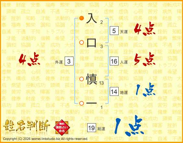 生活面を象徴する運勢です。外部から受ける影響力を表し、結婚運、家庭運や職場、環境への順応性を表します。総運から人運を引いた画数。姓や名が1文字の場合を除く。