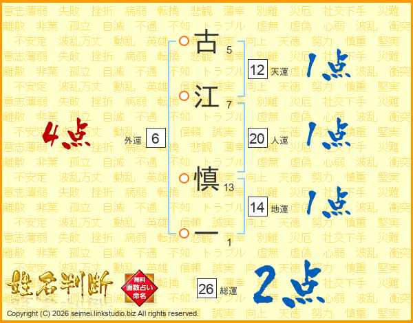 画数の奇数(○陽)と偶数(●陰)の配列で吉凶を占います。どちらかにかたよる名前は大凶名で避ける必要があります。画数の奇数偶数。