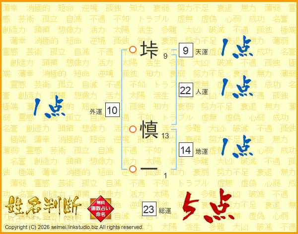 生活面を象徴する運勢です。外部から受ける影響力を表し、結婚運、家庭運や職場、環境への順応性を表します。総運から人運を引いた画数。姓や名が1文字の場合を除く。